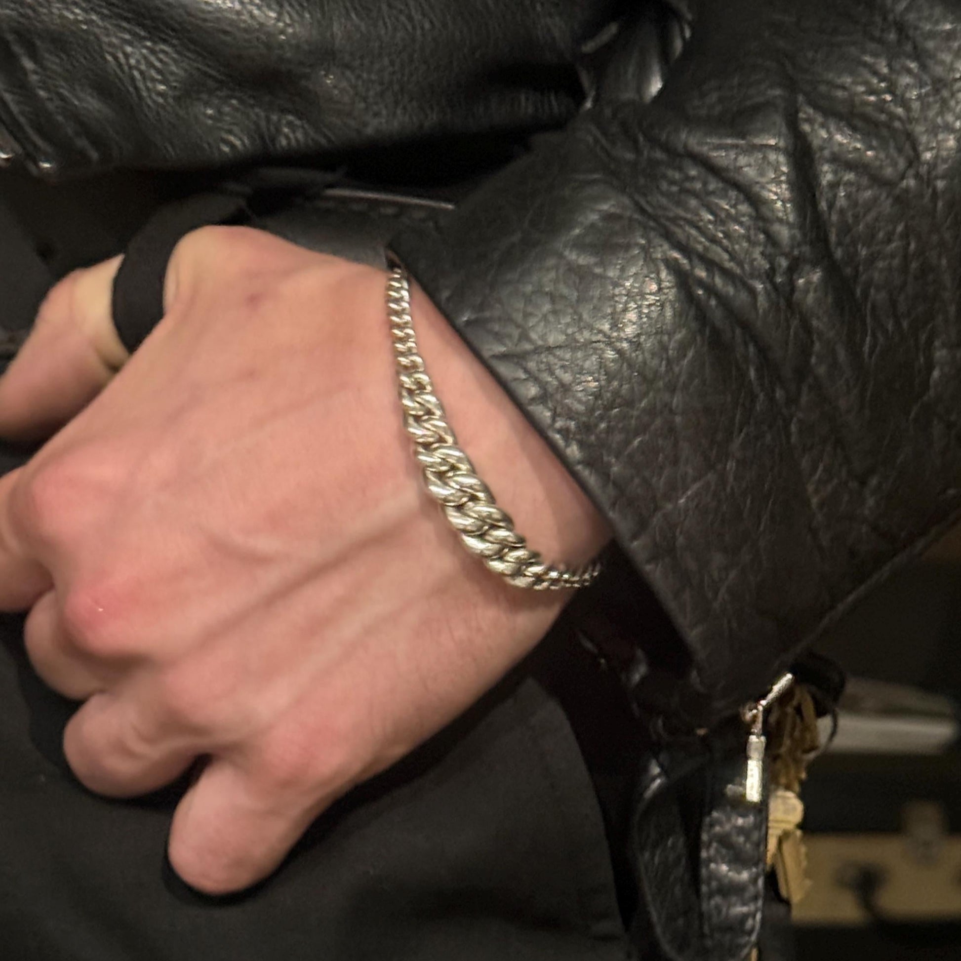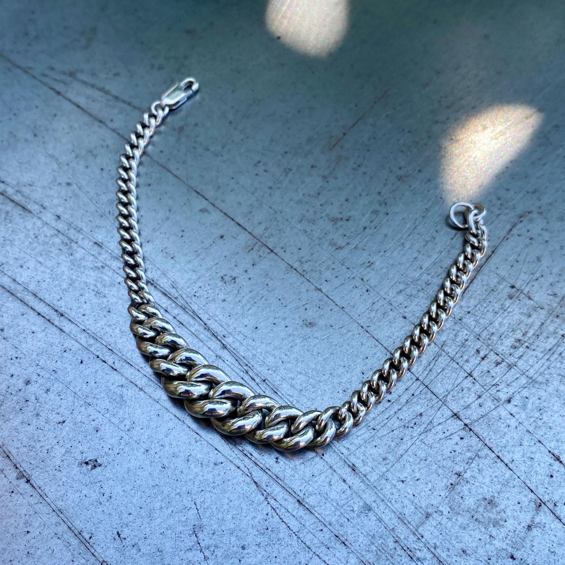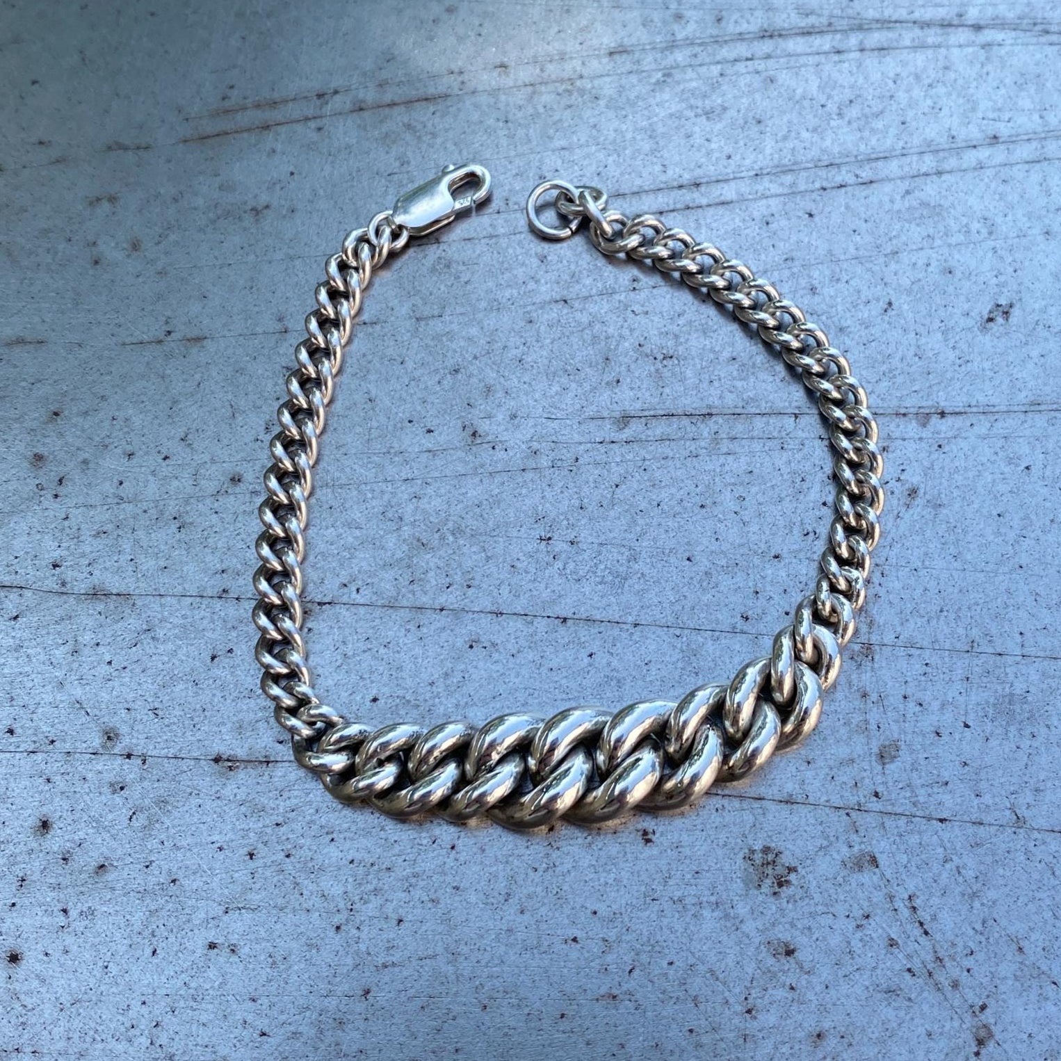 Inspired by vintage British watch chains, this is a graduated bracelet hand made out of sterling silver.